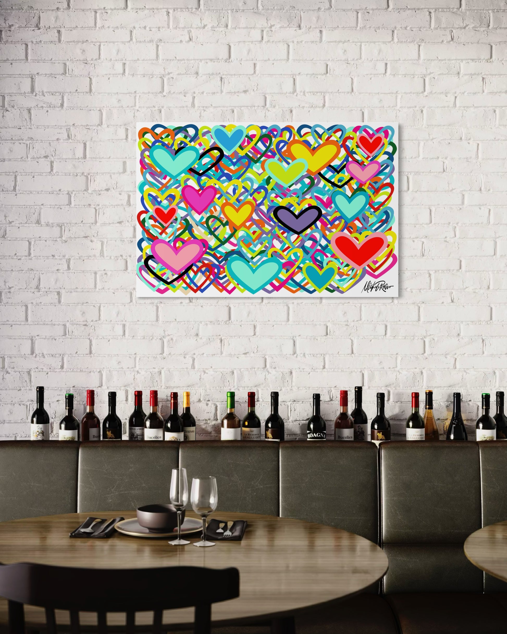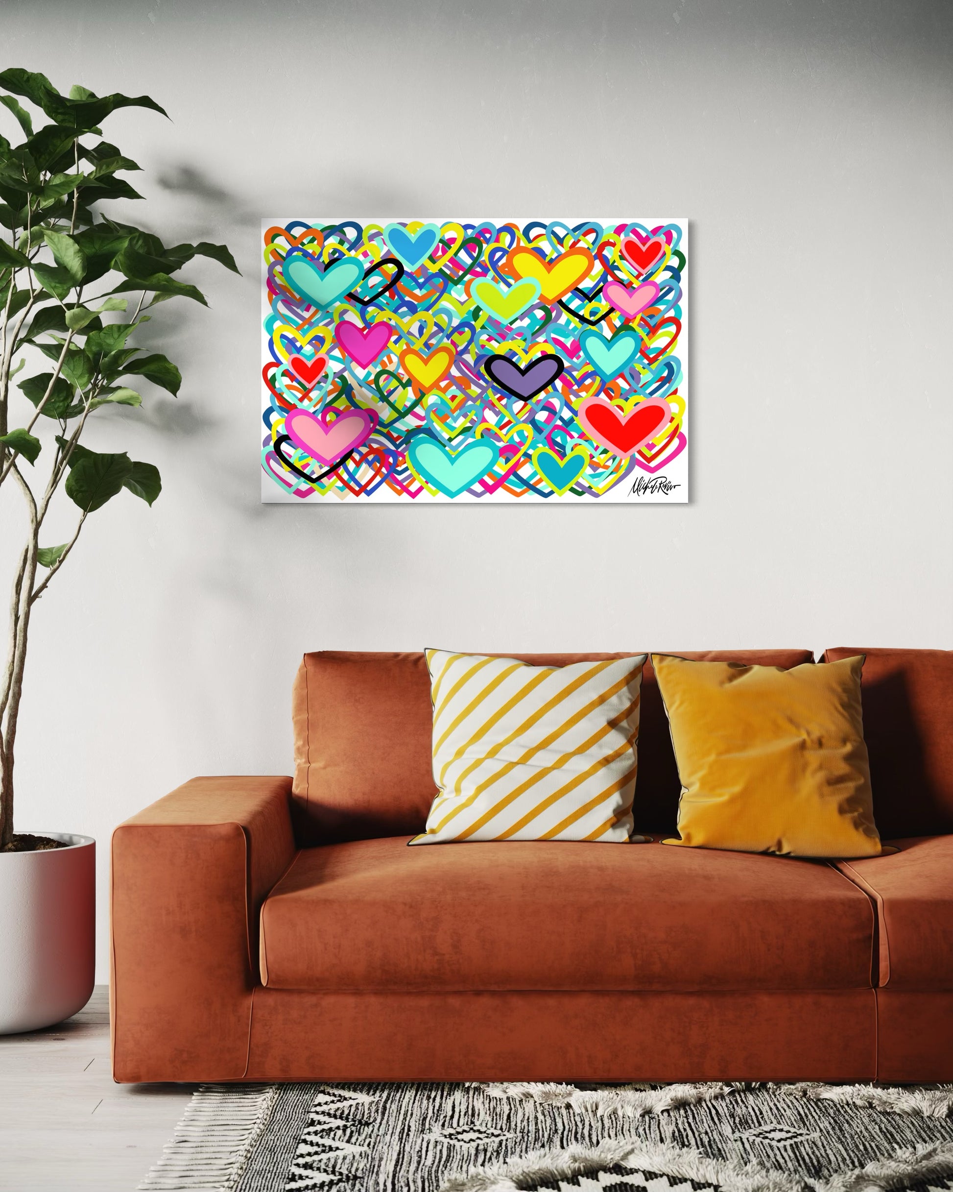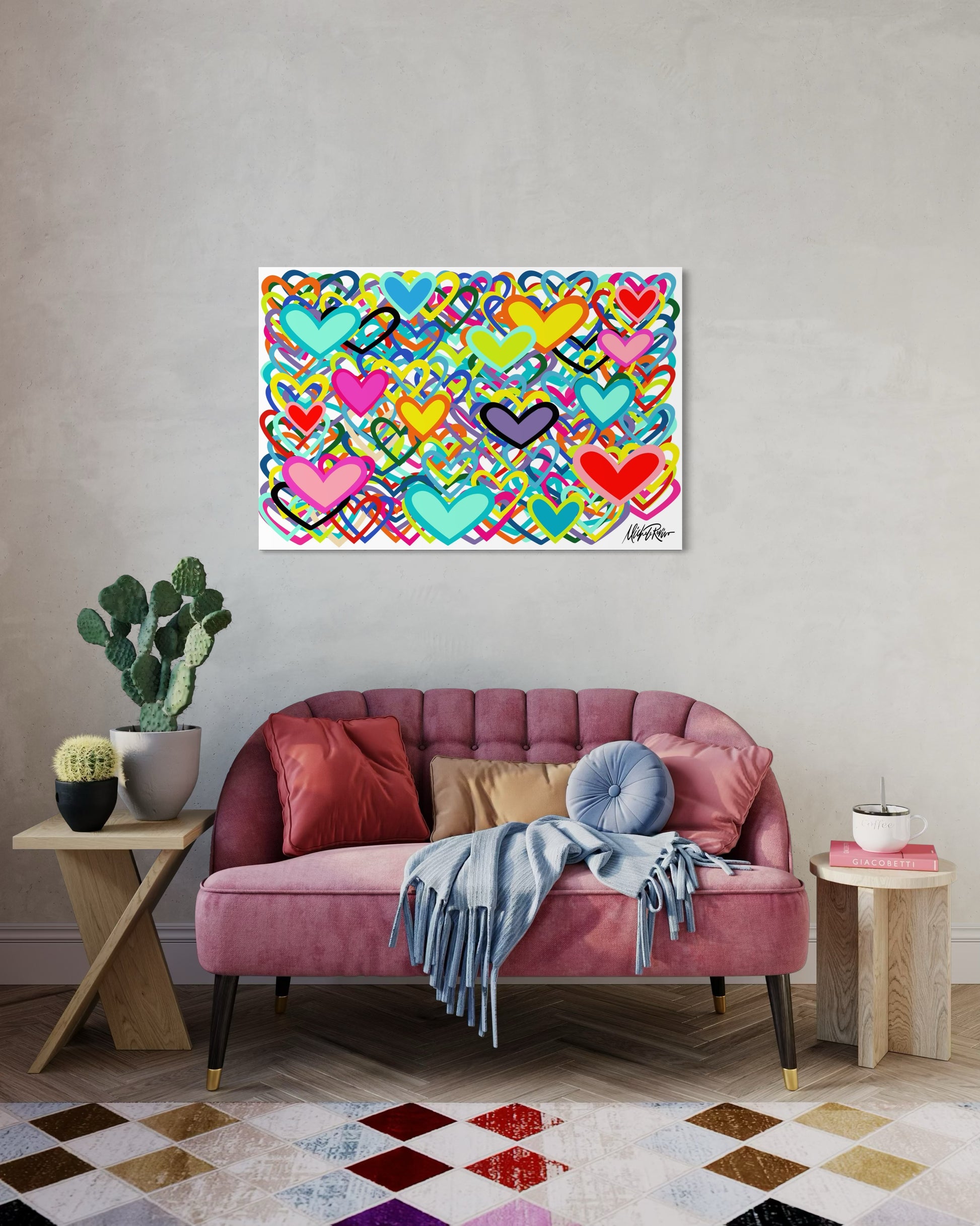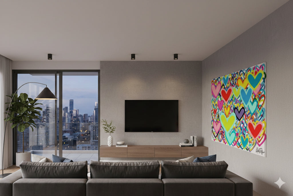 LEV — the Hebrew word for heart — is a vibrant celebration of love, connection, and emotion. Layered hearts in bold, playful colours move freely across the canvas, creating a sense of joy, warmth, and openness.